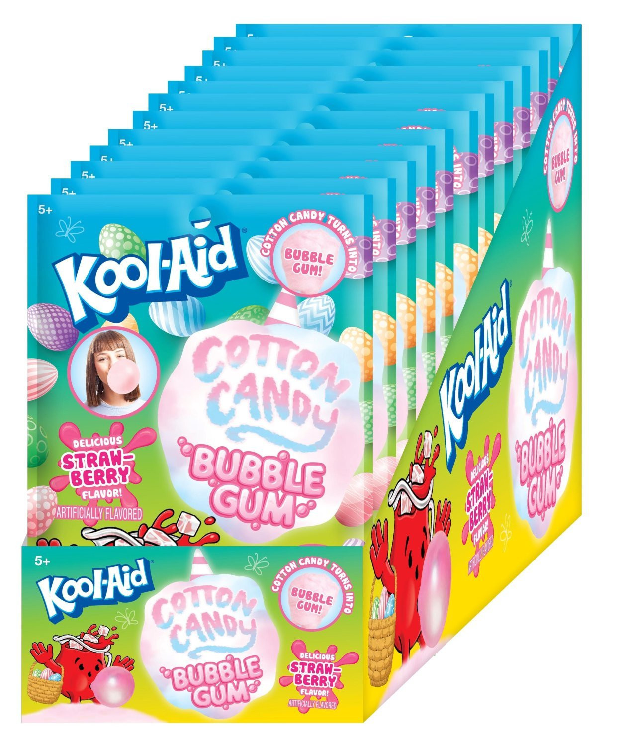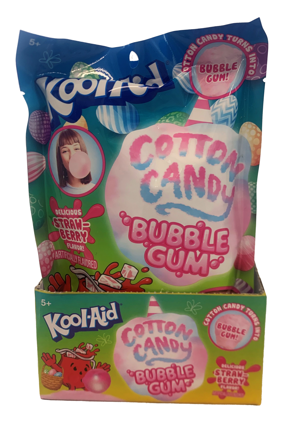 #52658 Kool-Aid Easter Cotton Candy Bubble Gum Peg Bag 1oz. Delicious strawberry cotton candy that turns into gum as you chew. Packed 2x12 = 24ct. Master Cases.
