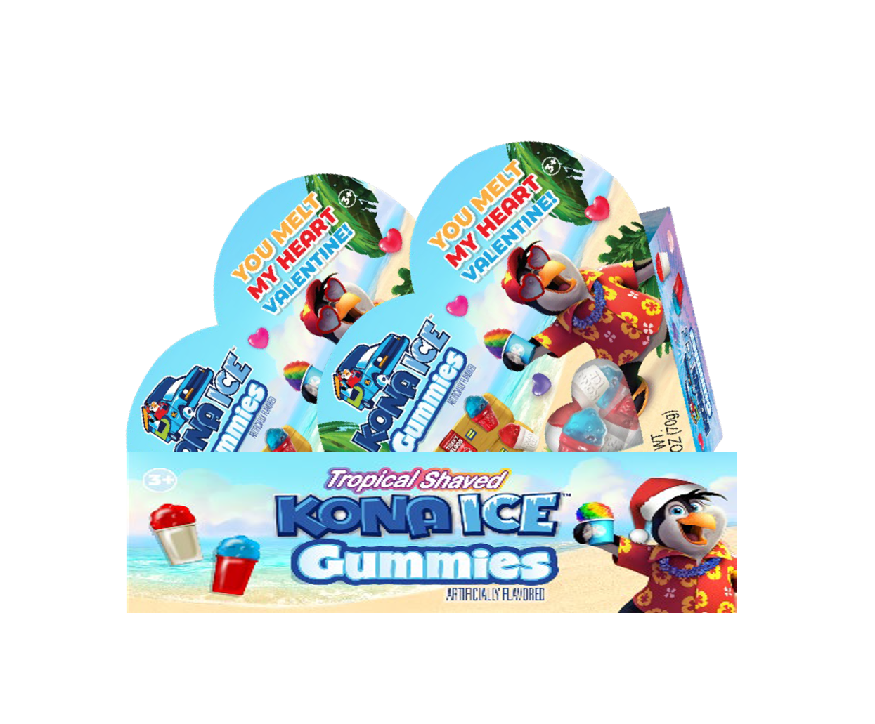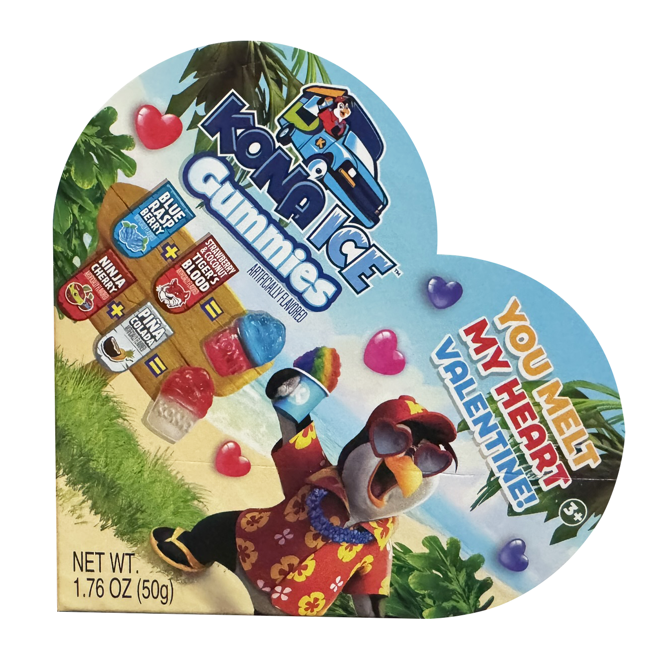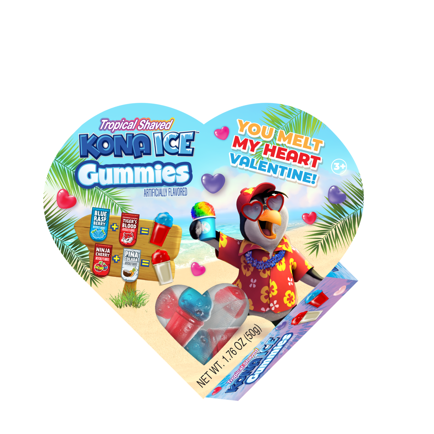 Kona Ice Valentine Gummy Heart Box 1.76oz DELICIOUS Gummies in top Kona Ice flavors of Tiger's Blood with Blue Raspberry, and Ninja Cherry with Pina Colada, in a heart shaped box. The perfect Valentine for your Valentine. 24ct. master case.